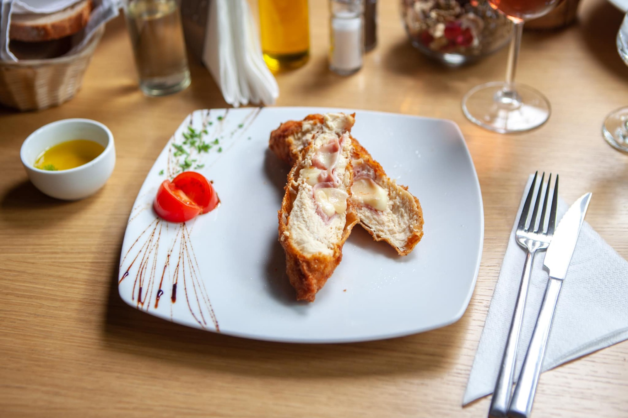 Piept de pui pane, umplut cu cașcaval (Sajttaltöltött, panírozott csirkemell)